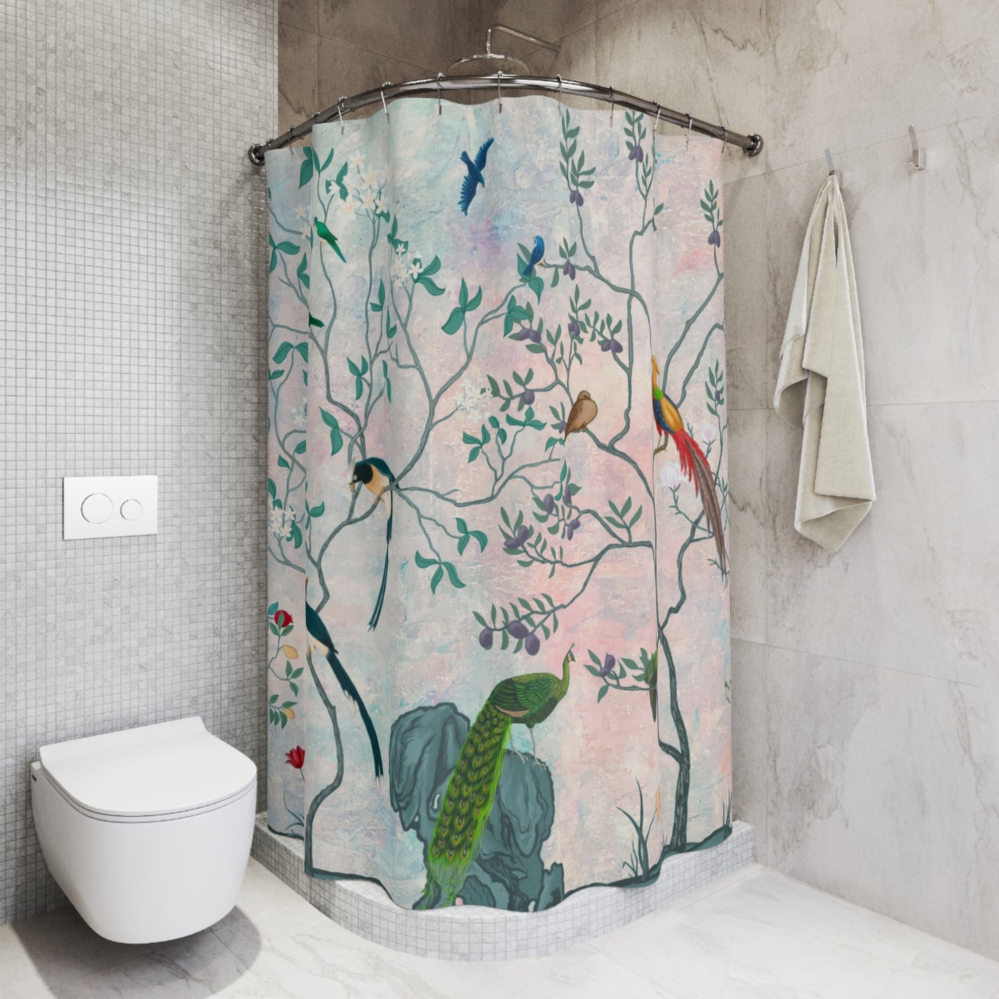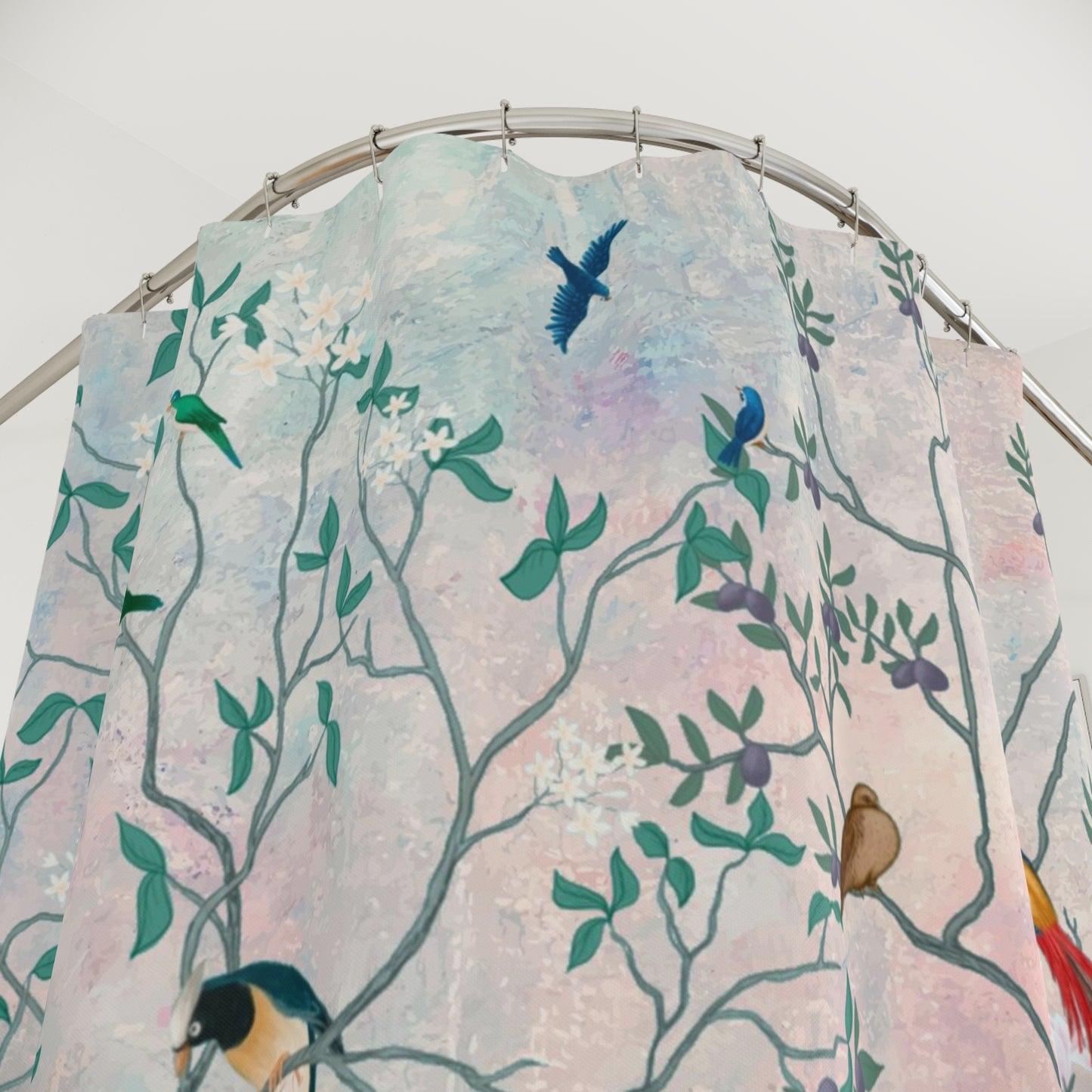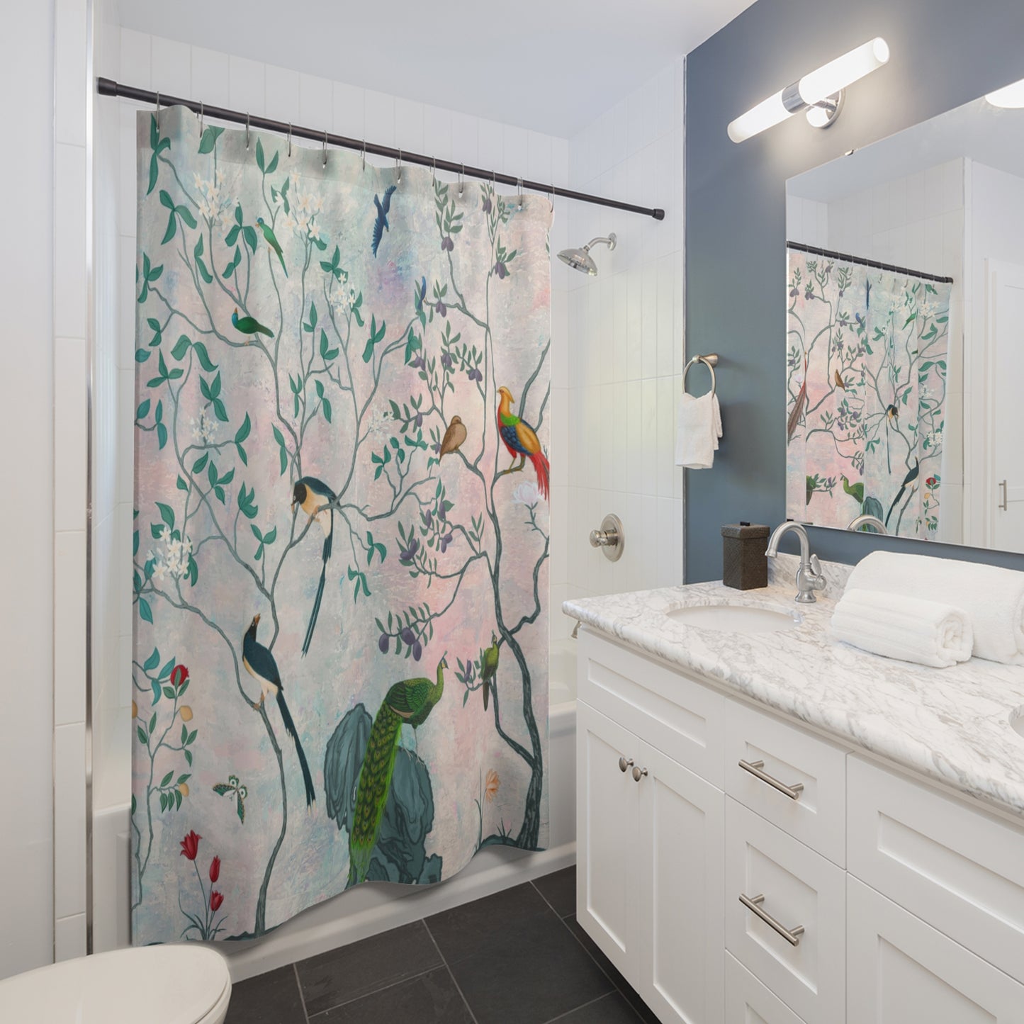 Add a touch of style to your bathroom with our unique shower curtains. This beautiful chinoiserie design featuring a charming oriental bird garden on a delicate aqua blush pink background will add a touch of timeless elegance and vintage charm to your home.
