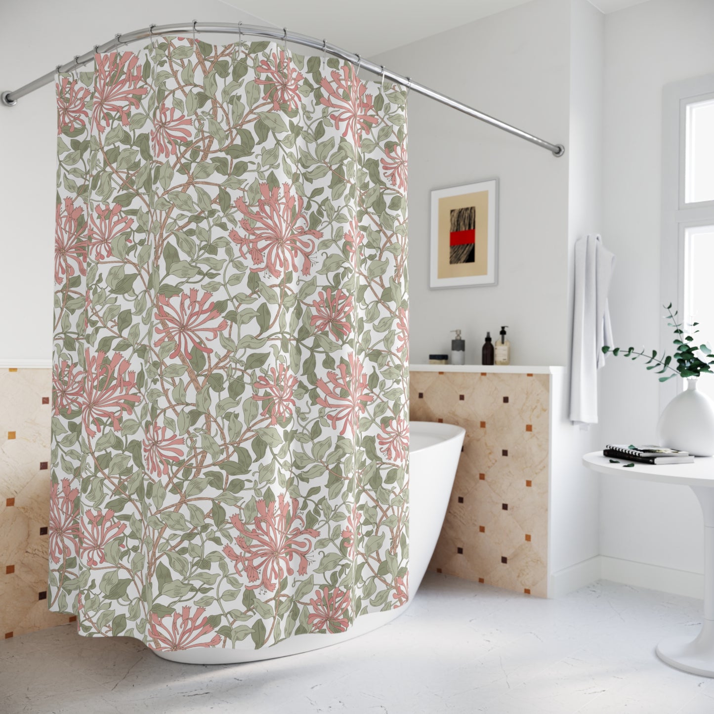 Add a touch of style to your bathroom with our unique shower curtains. This beautiful modern twist on a vintage William Morris design in a charming green and pink honeysuckle floral pattern against a white background will add a touch of timeless elegance and charm to your home.