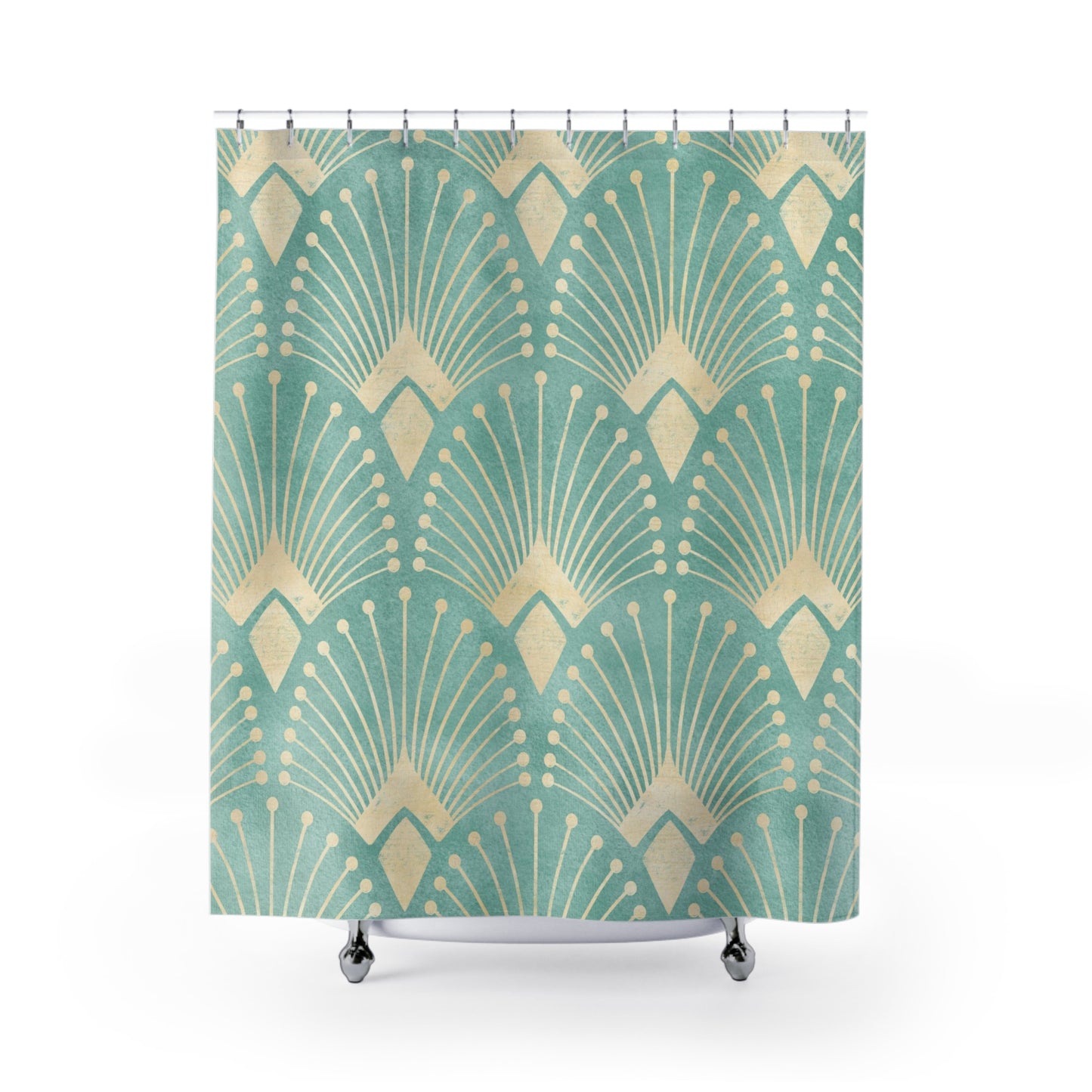 Add a touch of style to your bathroom with our unique shower curtains. This beautiful vintage art deco fan pattern design in shades of soft mint green blue and gold will add a touch of timeless elegance and charm to your home.