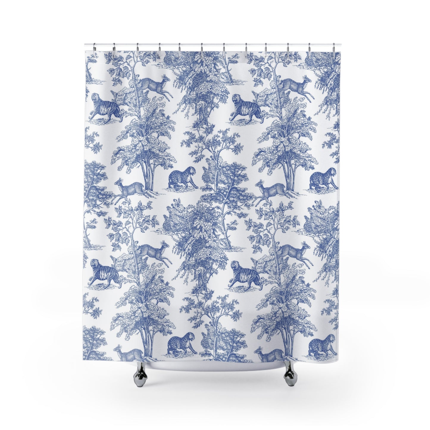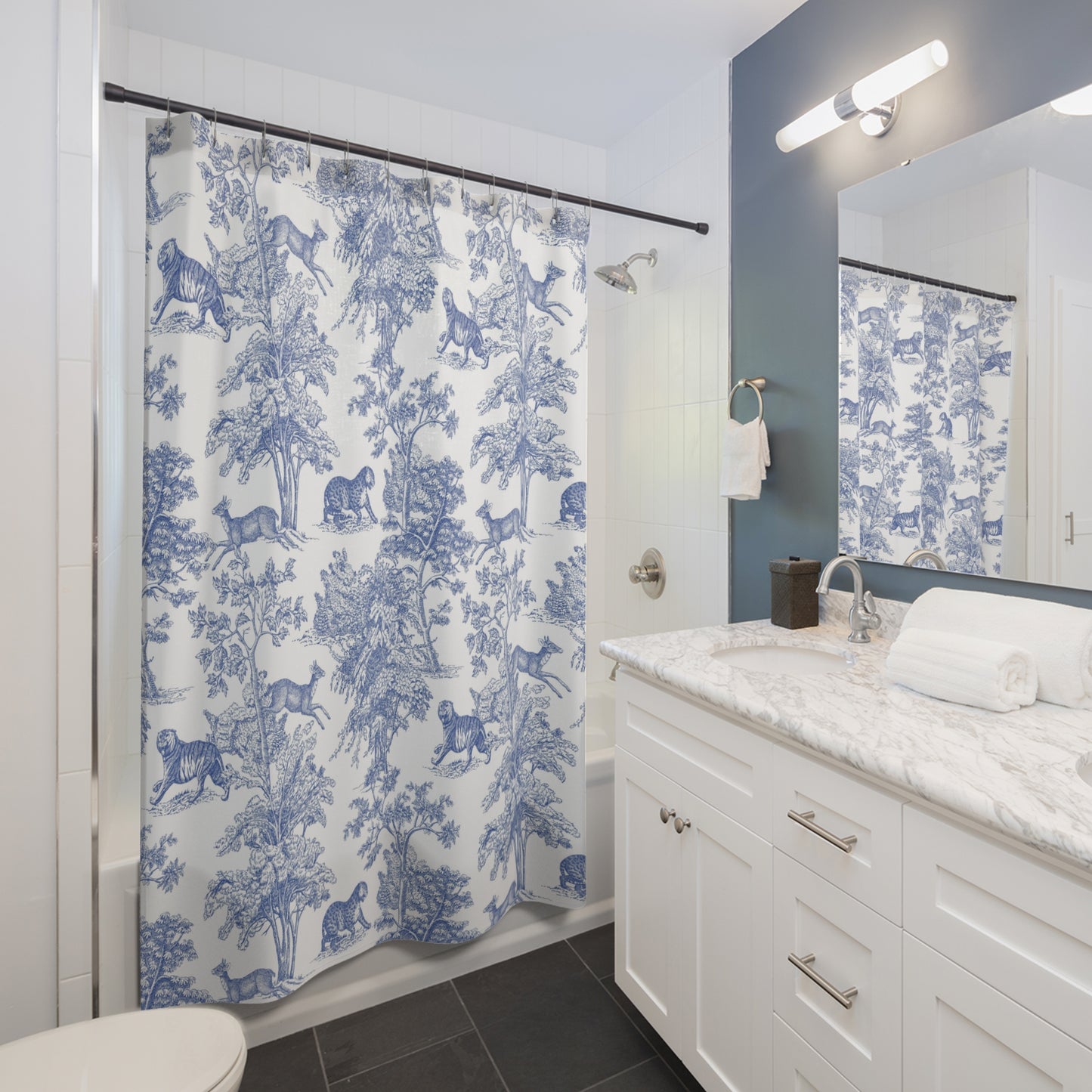 Add a touch of style to your bathroom with our unique shower curtains. This beautiful blue and white tiger jungle design will add a touch of timeless elegance and charm to your home. This Asian botanical pattern is in the vintage French toile de jouy style for a classic twist.