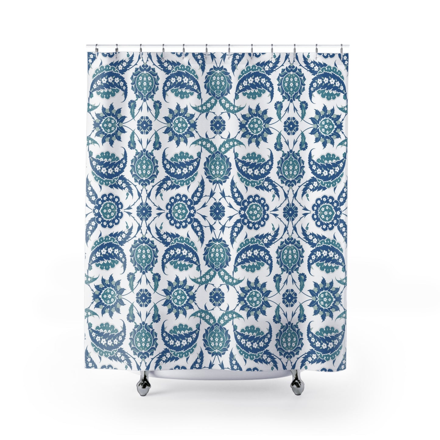 Add a touch of style to your bathroom with our unique shower curtains. This beautiful arabesque design in shades of blue, green and white will add a touch of timeless elegance and exotic charm to your home.