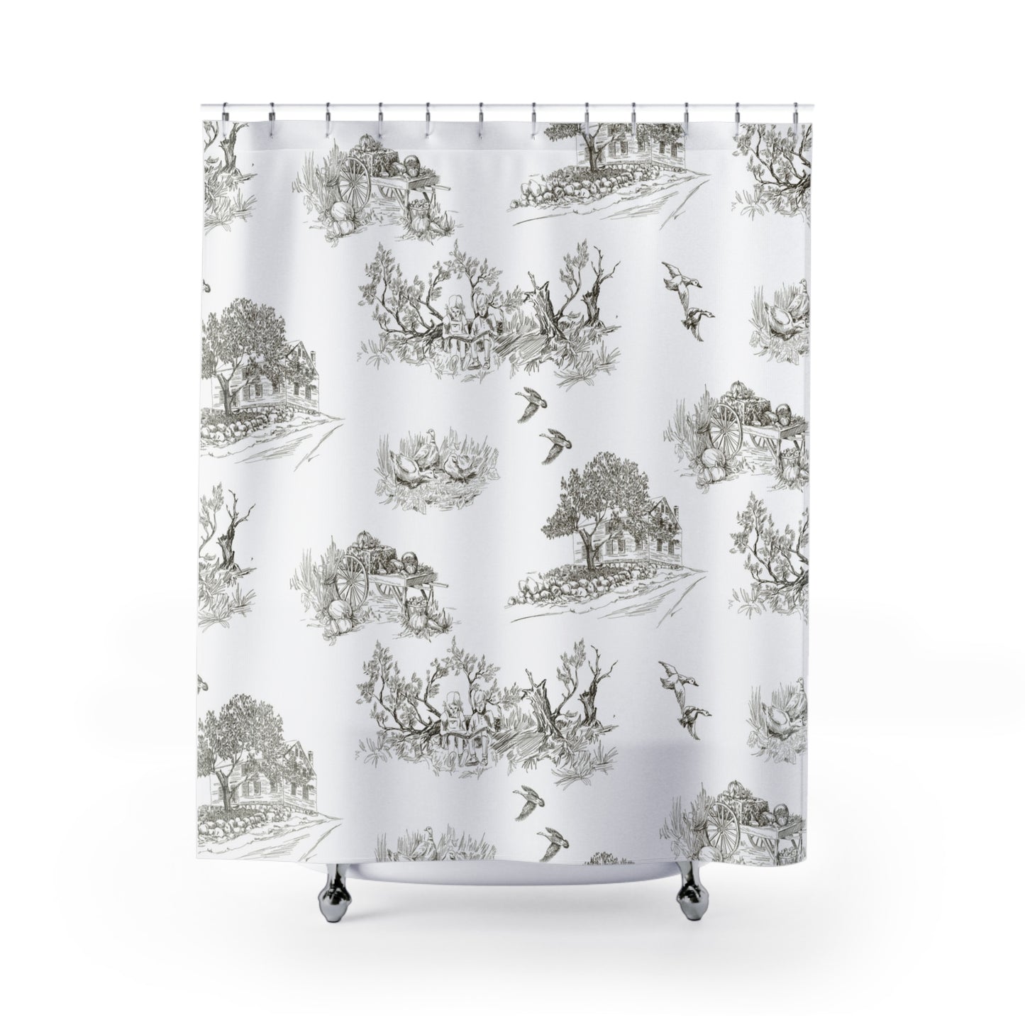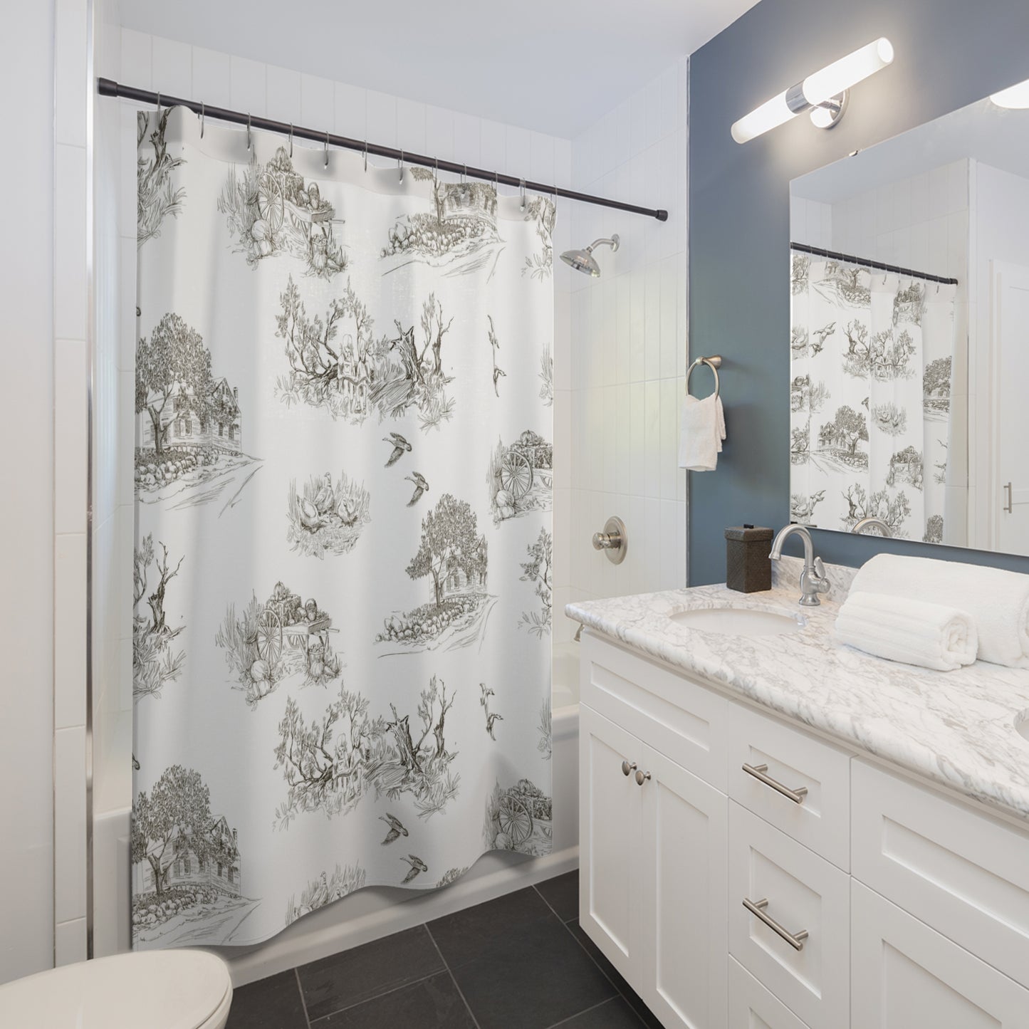 Add a touch of style to your bathroom with our unique shower curtains. This beautiful soft black and white French toile design will add a touch of timeless elegance and European charm to your home.