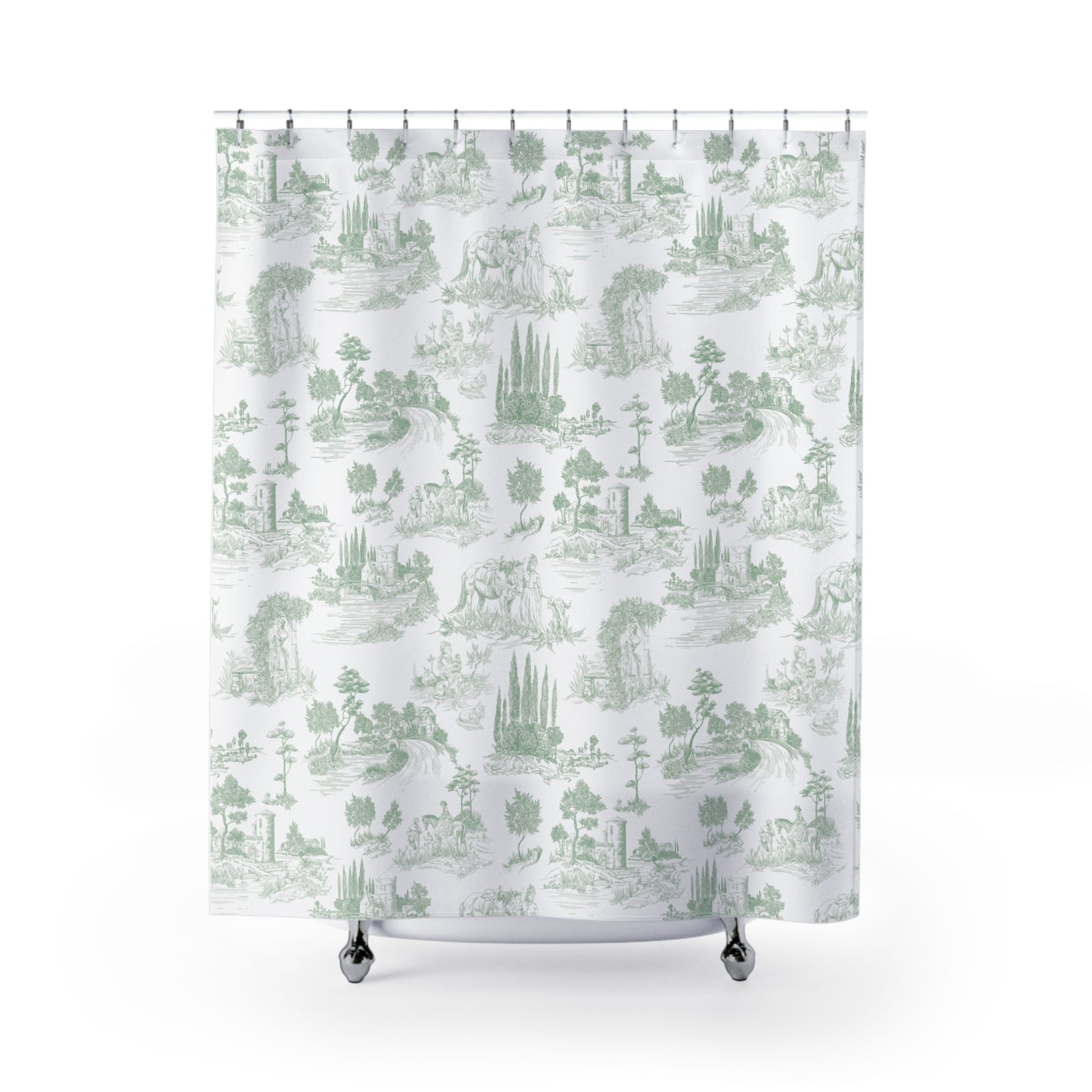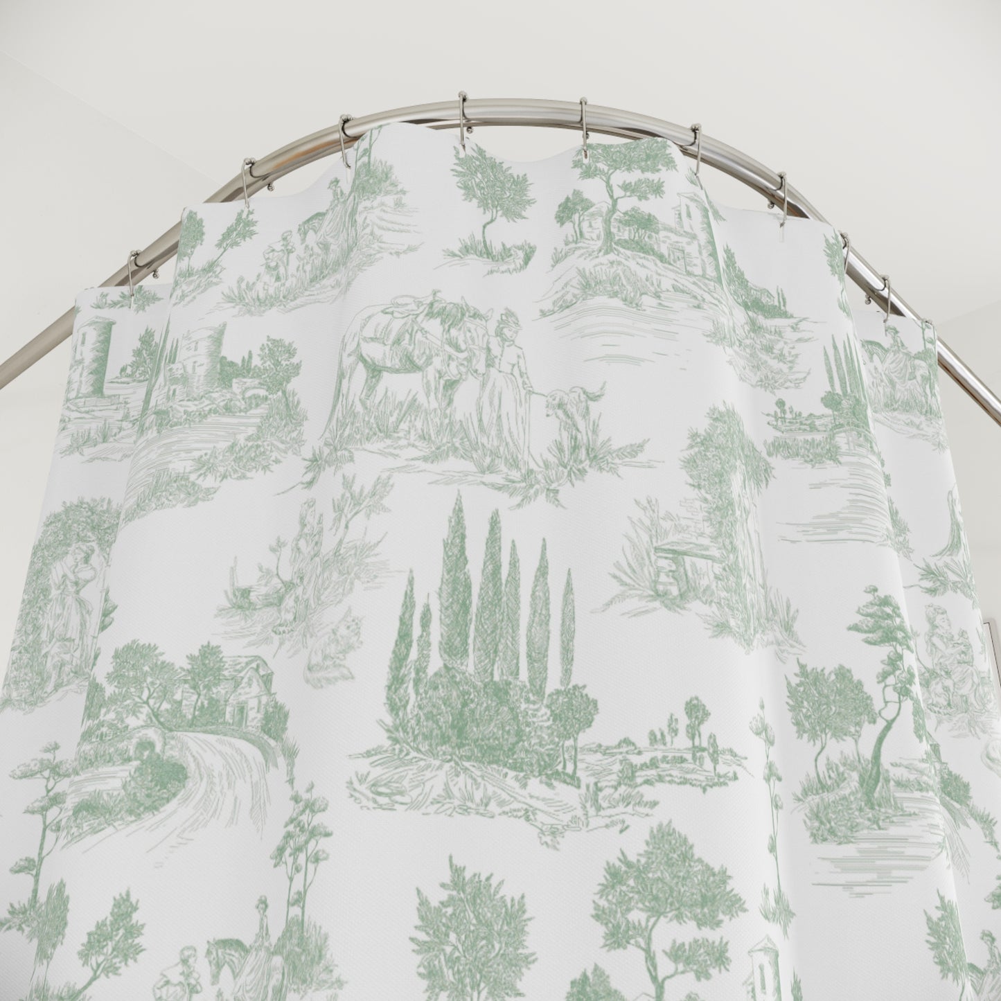 Add a touch of style to your bathroom with our unique shower curtains. This beautiful vintage French toile de jouy design in light sage green and white will add a touch of timeless elegance and vintage charm to your home.