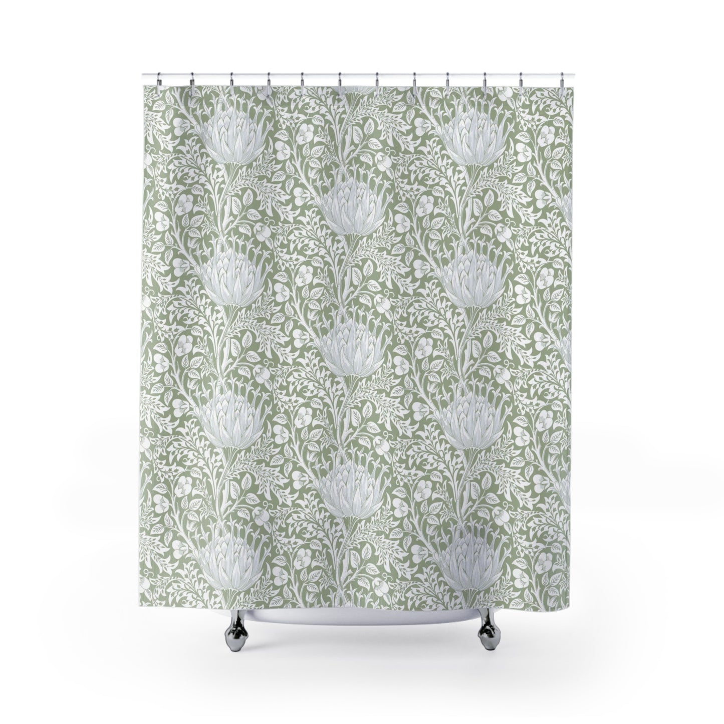 Add a touch of style to your bathroom with our unique shower curtains. This beautiful William Morris featuring a charming floral artichoke pattern in sage green will add a touch of timeless elegance and vintage charm to your home.