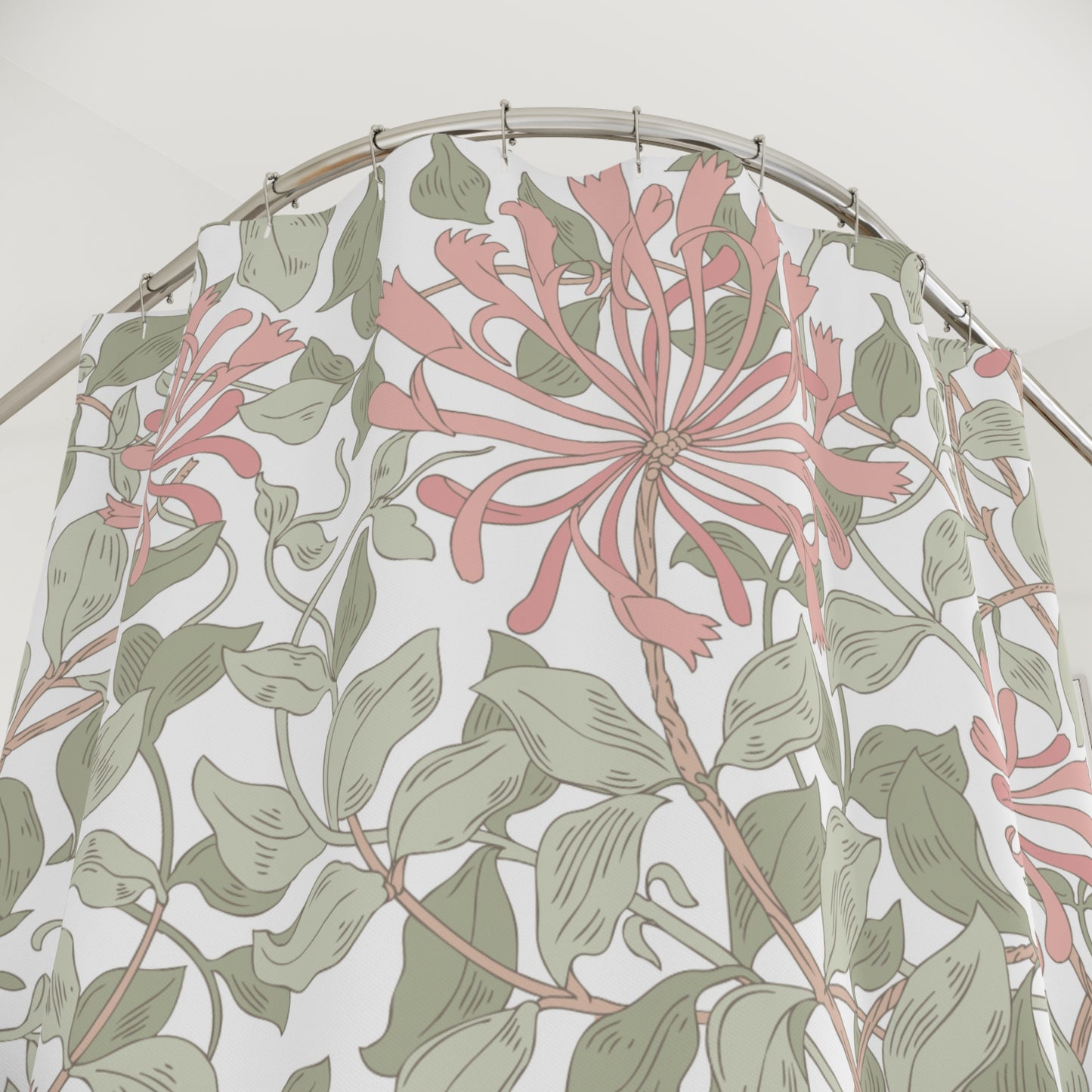 Add a touch of style to your bathroom with our unique shower curtains. This beautiful modern twist on a vintage William Morris design in a charming green and pink honeysuckle floral pattern against a white background will add a touch of timeless elegance and charm to your home. This honeysuckle design is a slightly lighter color variation of the original pink and green honeysuckle.