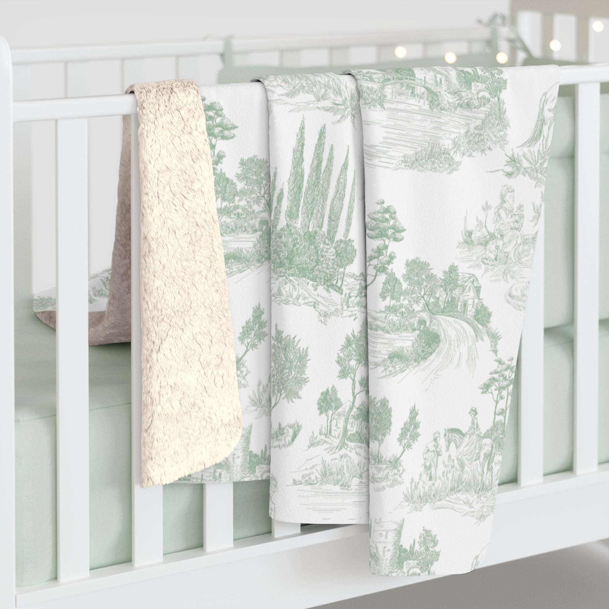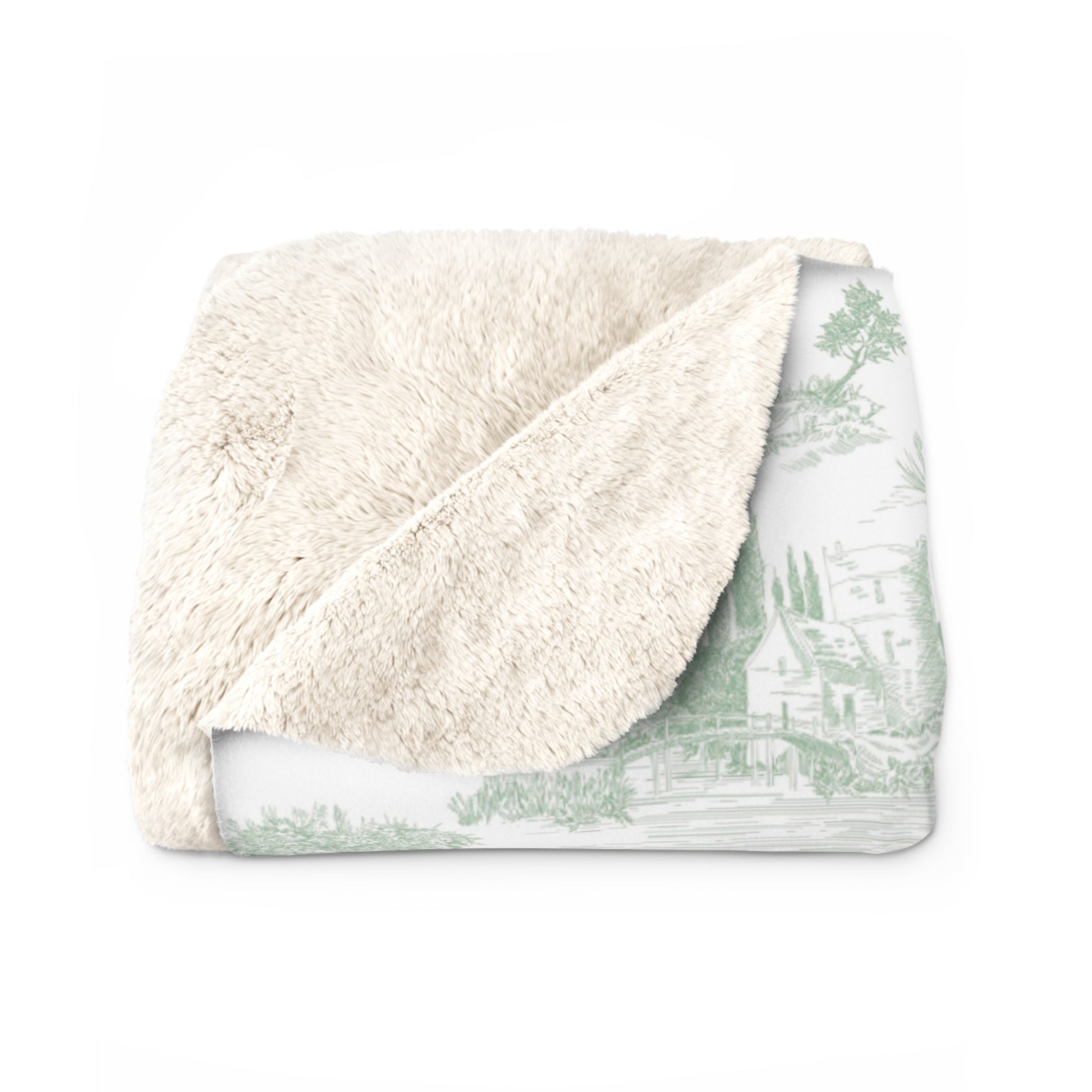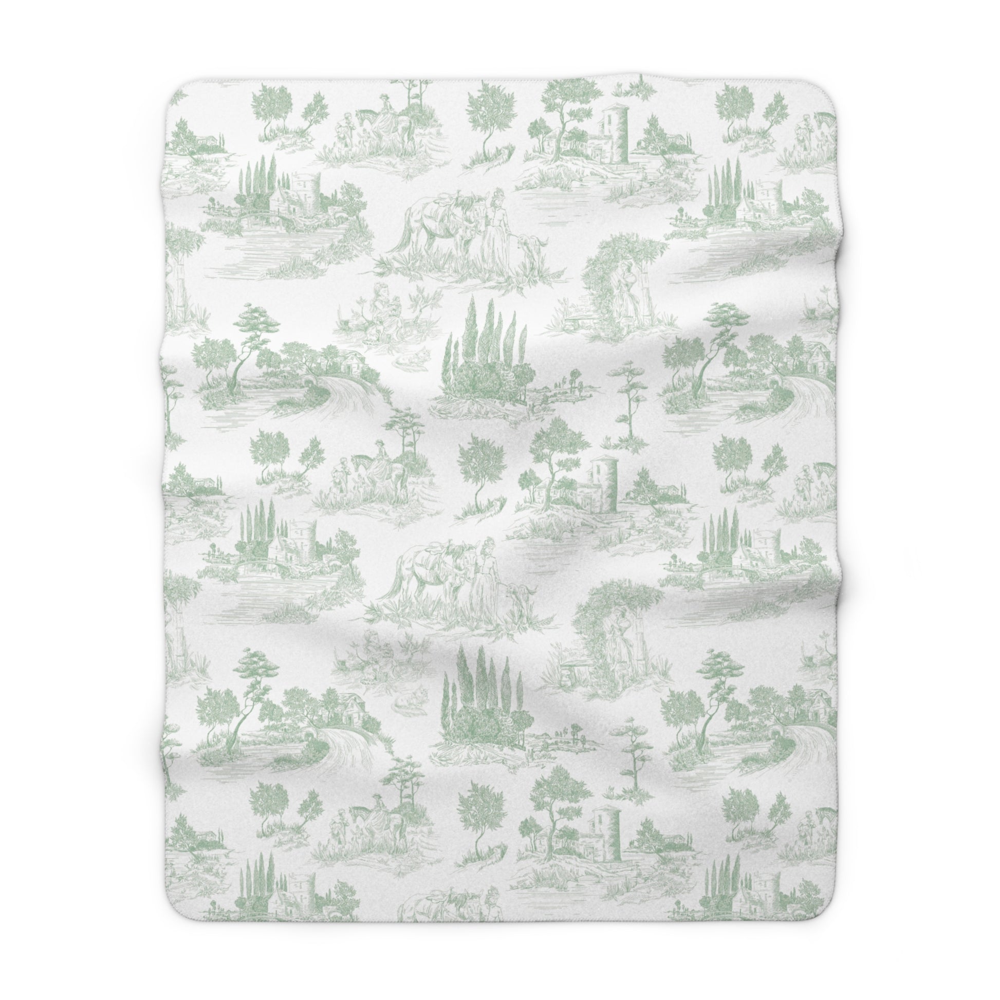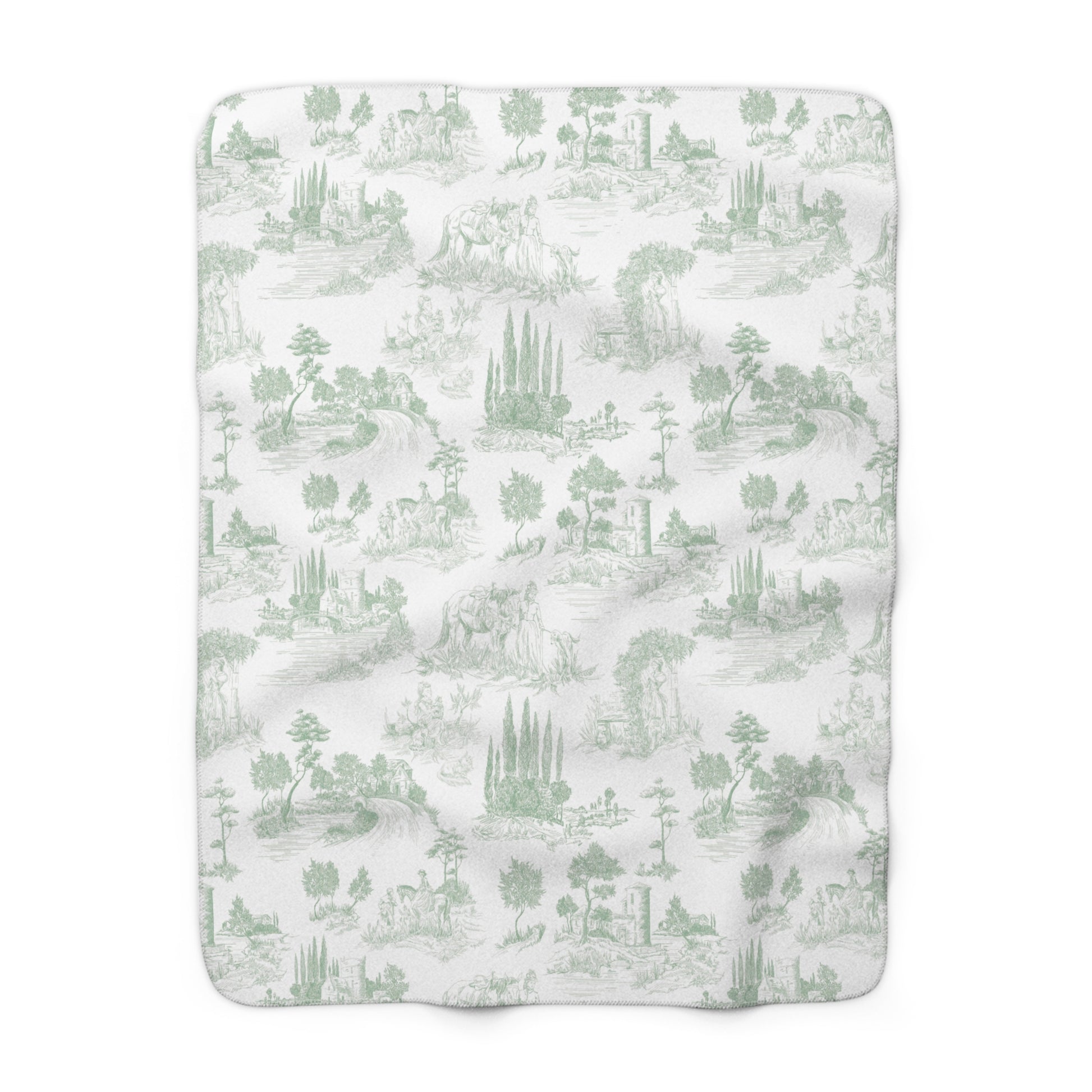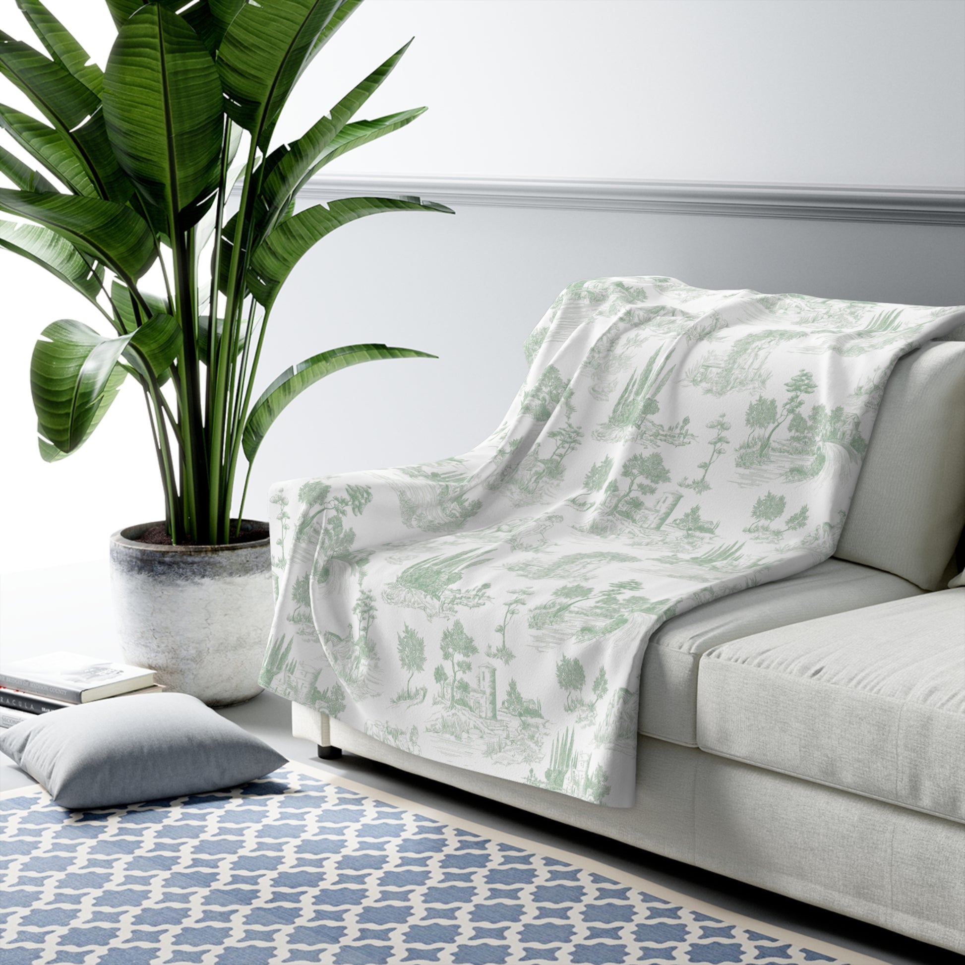 Toile de Jouy Sage Green Fleece Lined Blanket