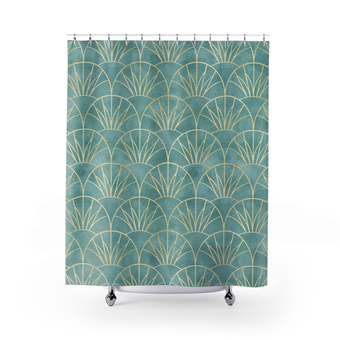 Add a touch of style to your bathroom with our unique shower curtains. This beautiful vintage art deco lotus flower design in shades of soft aqua mint green blue and gold will add a touch of timeless elegance and charm to your home.