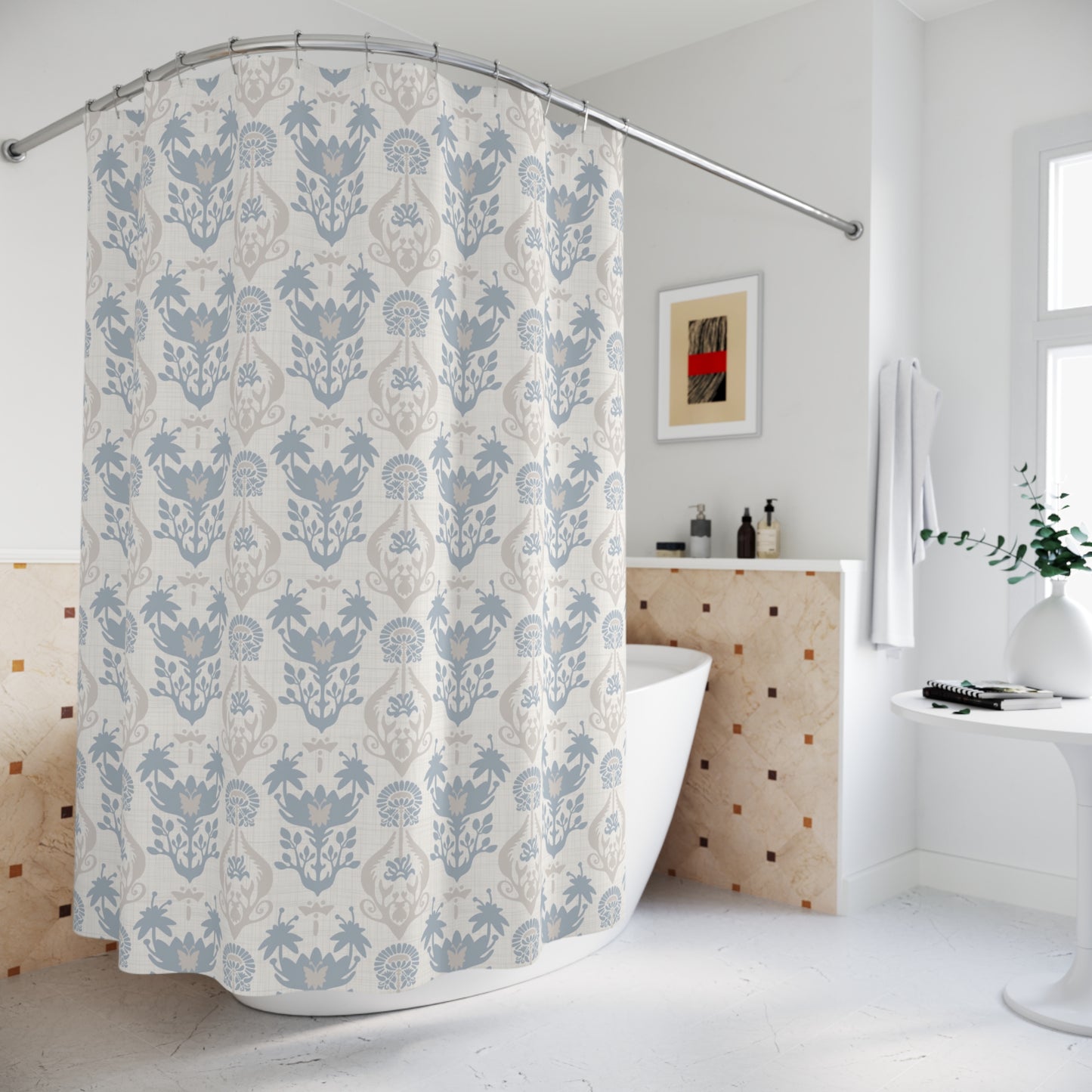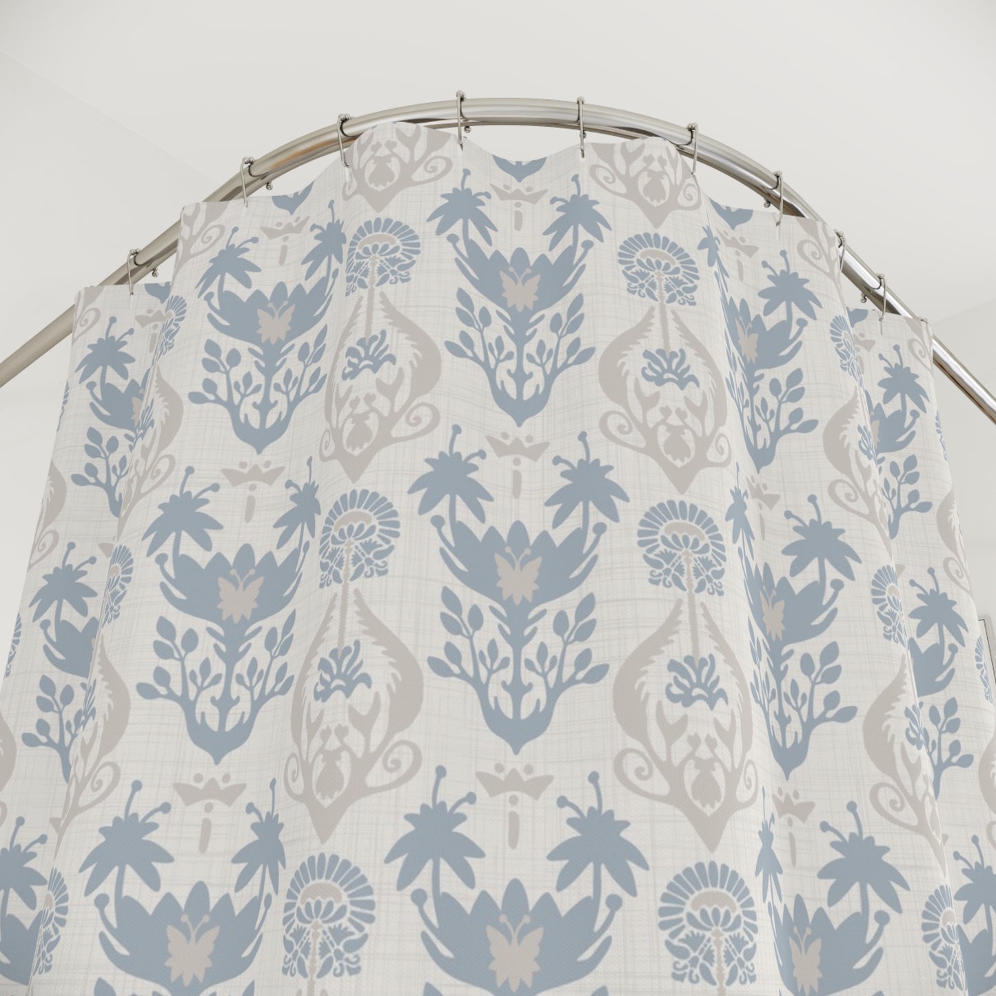 Add a touch of style to your bathroom with our unique shower curtains. This beautiful art nouveau design in shades of light beige and blue will add a touch of timeless elegance and European charm to your home.