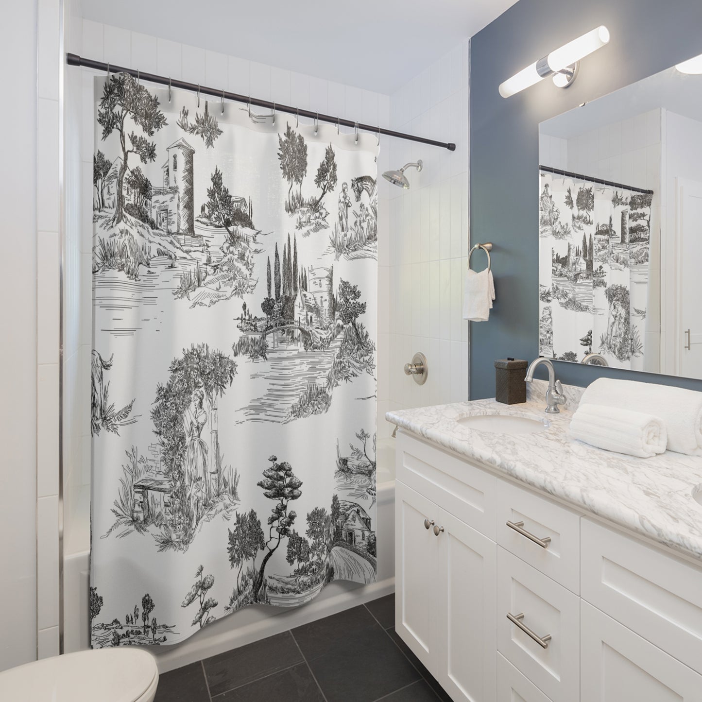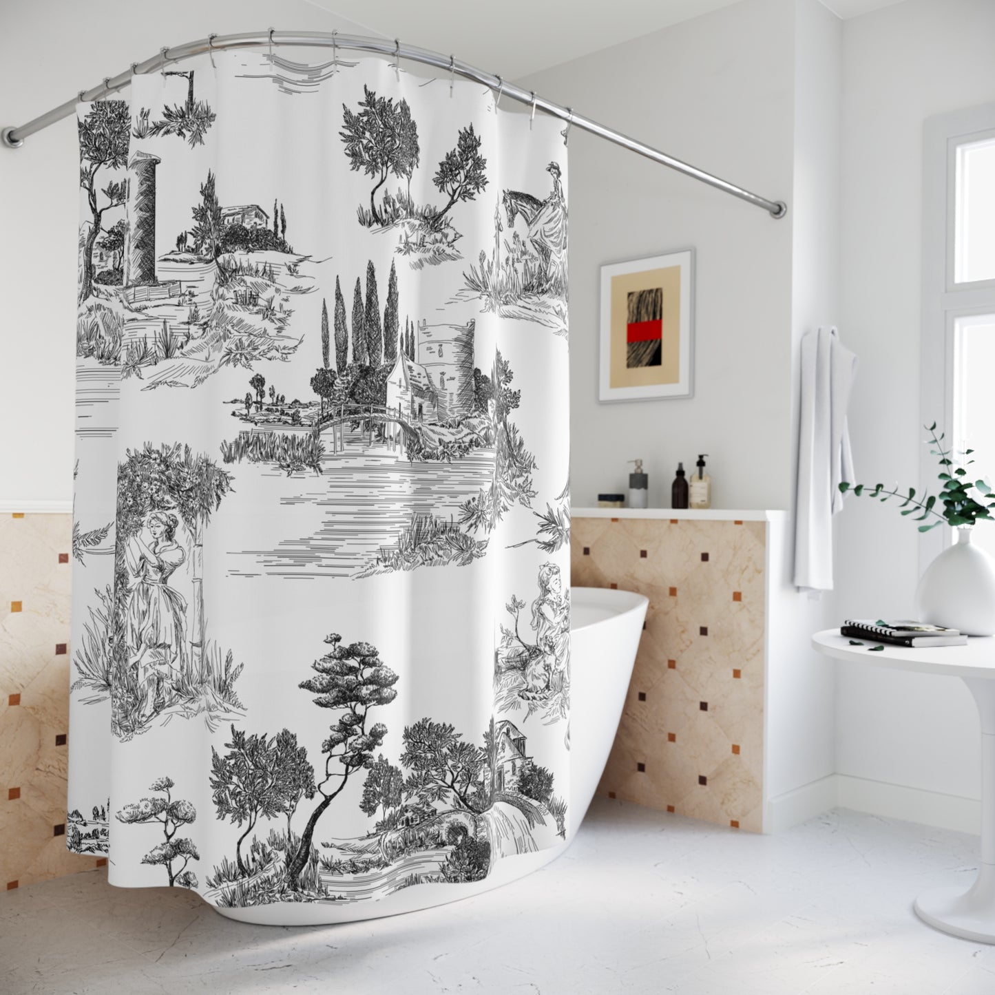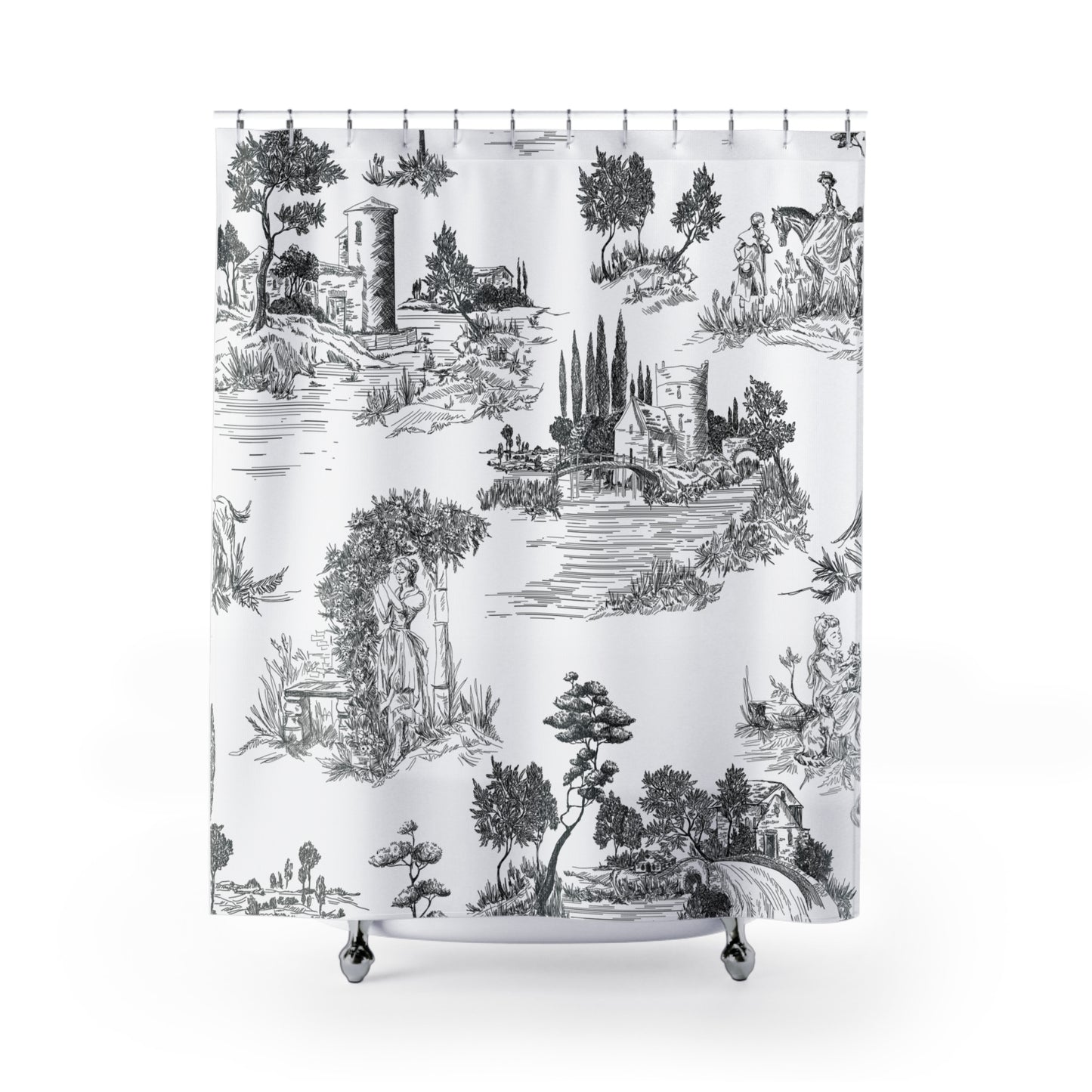 Add a touch of style to your bathroom with our unique shower curtains. This beautiful black and white French toile design will add a touch of timeless elegance and European charm to your home.