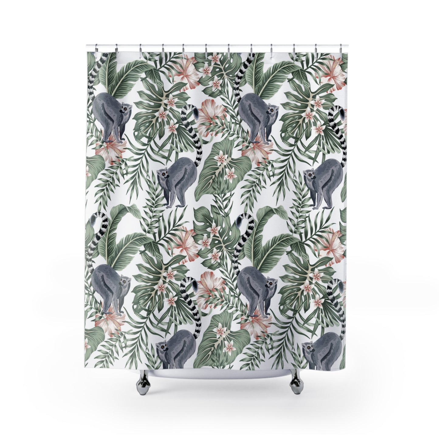 Add a touch of style to your bathroom with our unique shower curtains. This beautiful hibiscus lemur design will add a touch of botanical fun and tropical charm to your home.