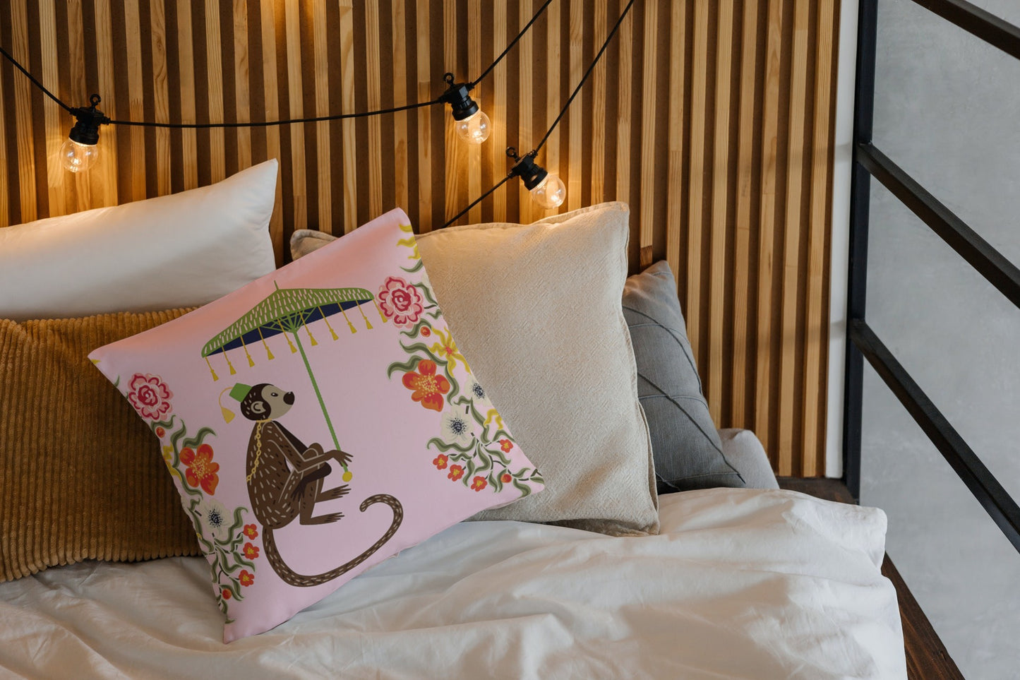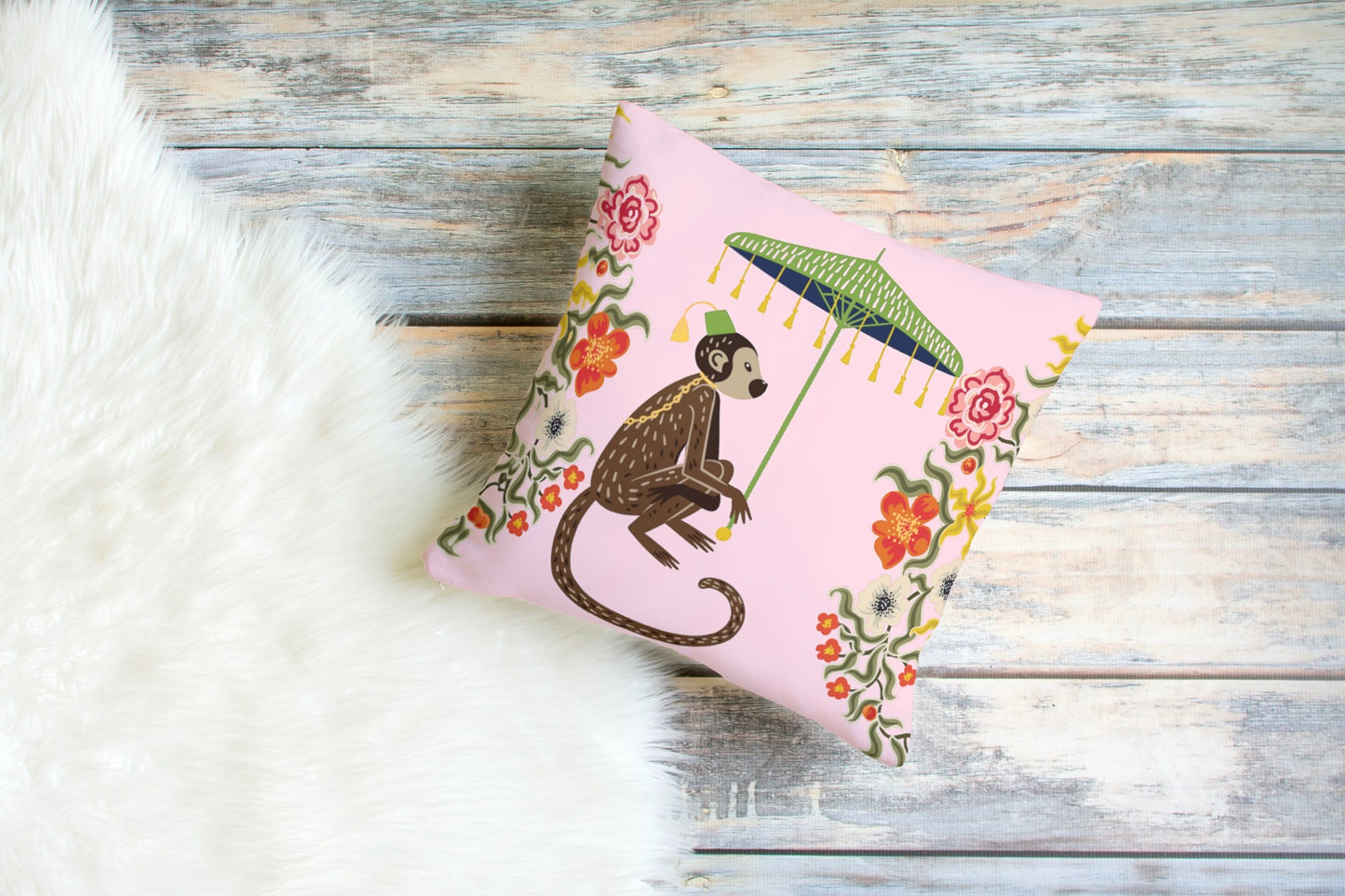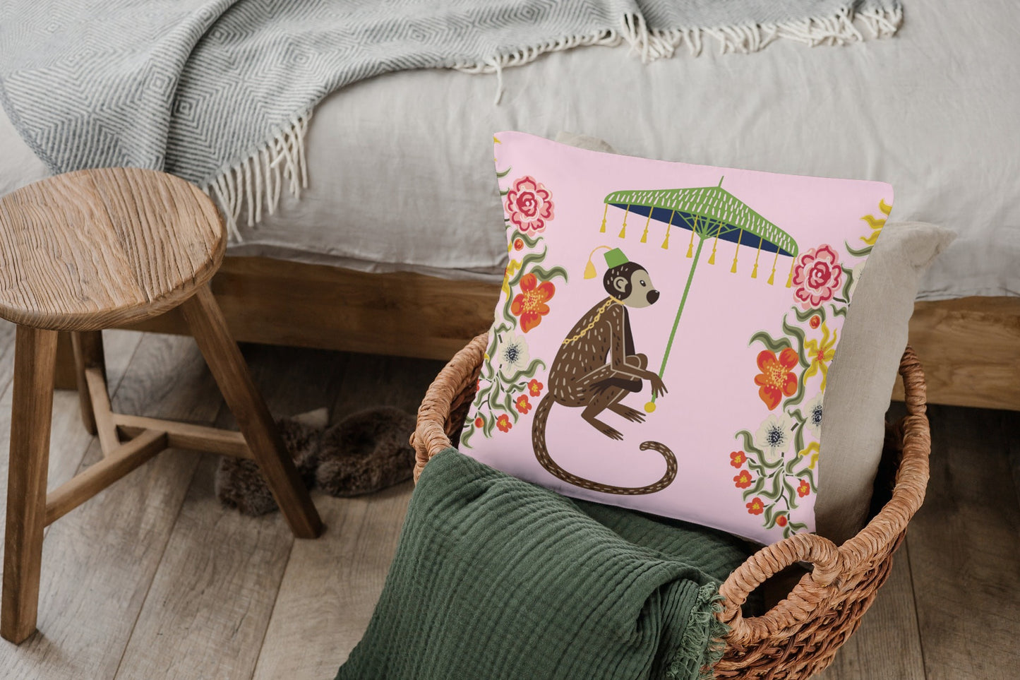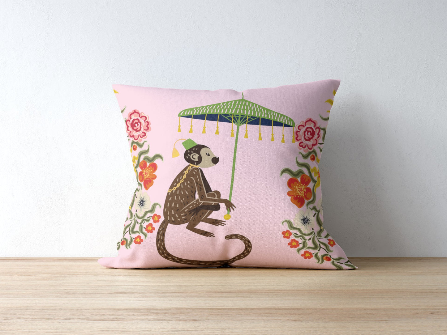 Kuta Outdoor Pillows Baby Pink Chinoiserie Monkey Umbrella