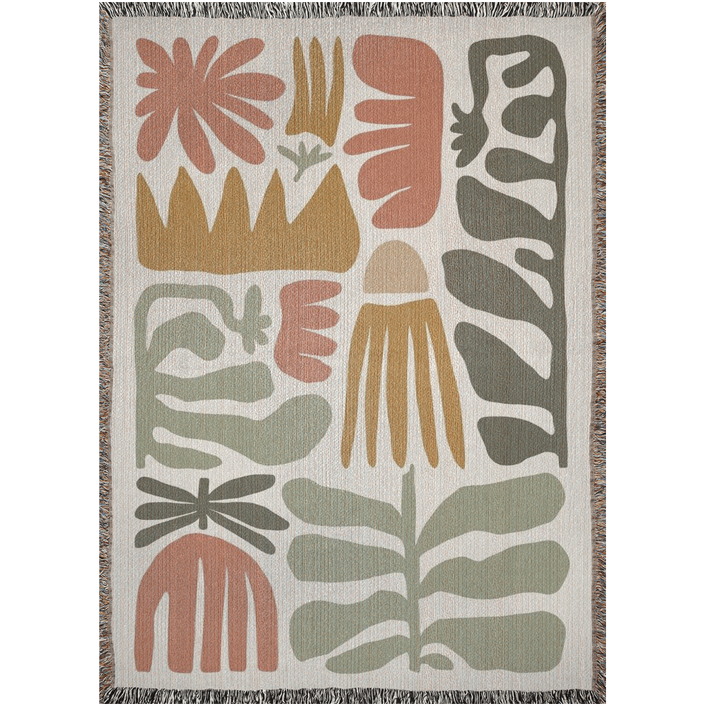 A beautiful abstract art pattern inspired by Henri Matisse in soothing earth tones of sage green, warm terracotta and cream. Bring a touch of botanical glamour to your home. Drape this beautiful throw over your bed, hang it on your wall, toss it on your couch. It's versatile, beautiful, cosy and warm.