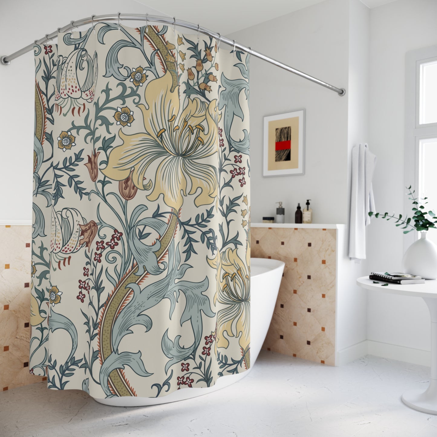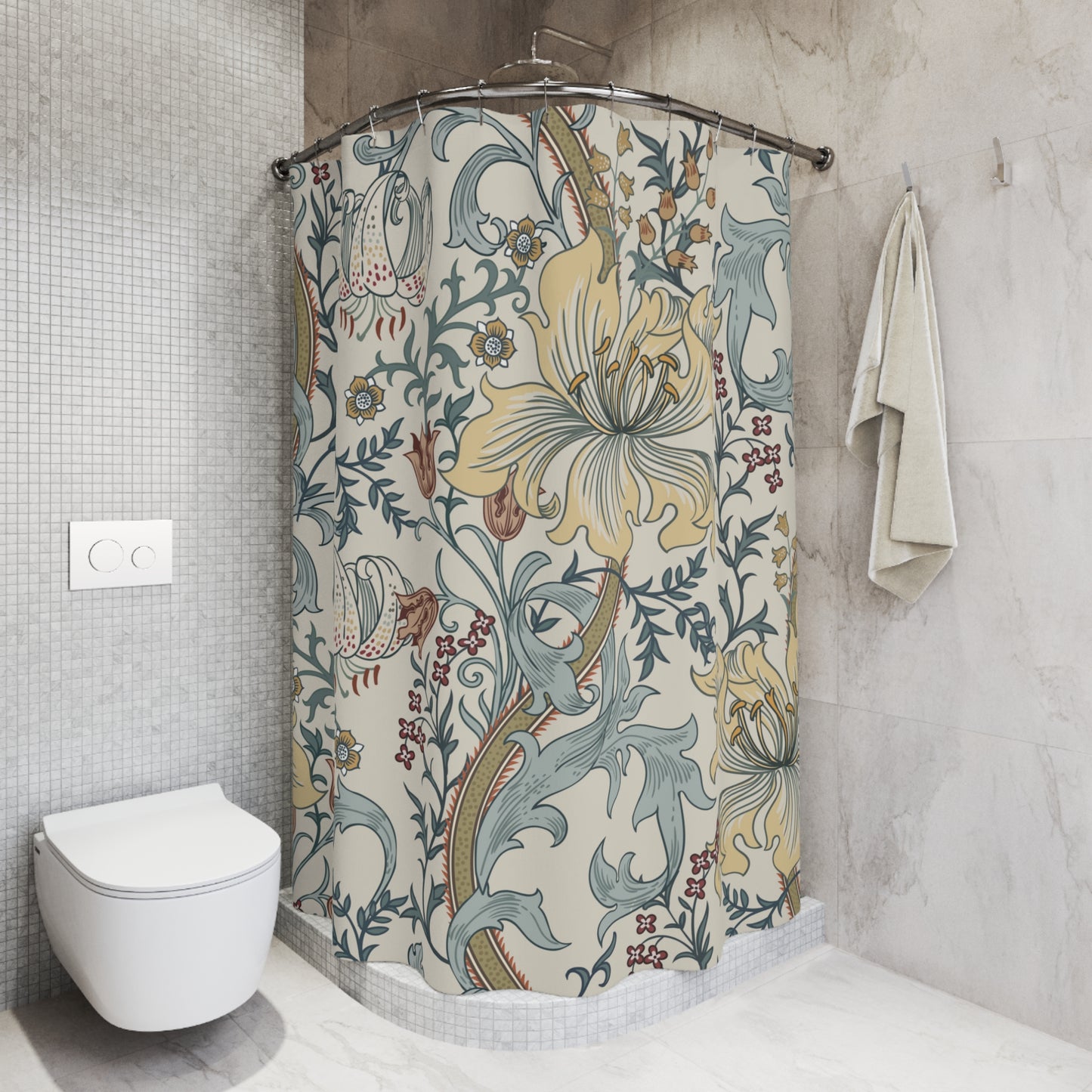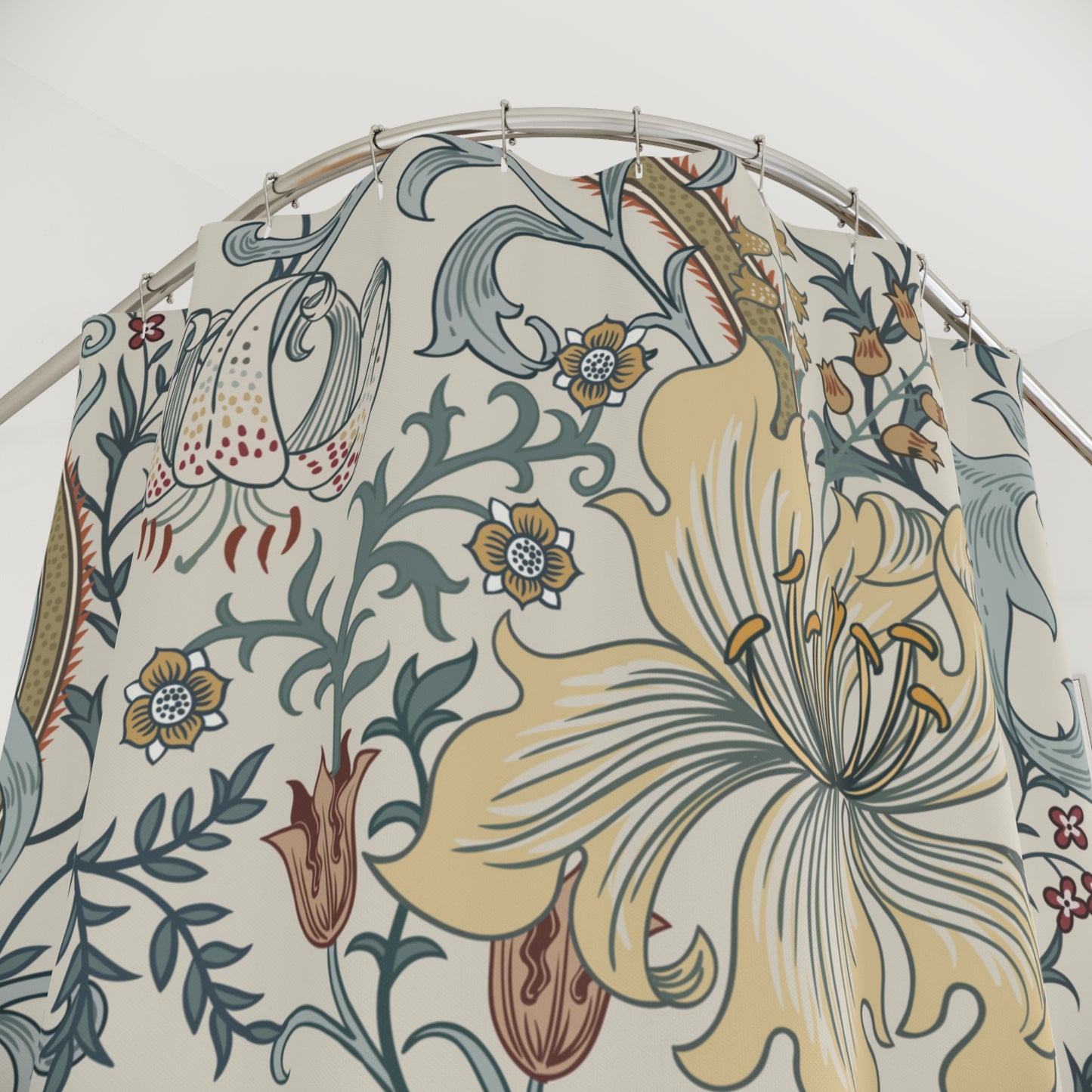 Add a touch of style to your bathroom with our unique shower curtains. This beautiful William Morris enchanted Golden Lily floral design in shades of blue, light brick pink, cream and yellow on a delicate cream background will add a touch of timeless elegance and vintage charm to your home.